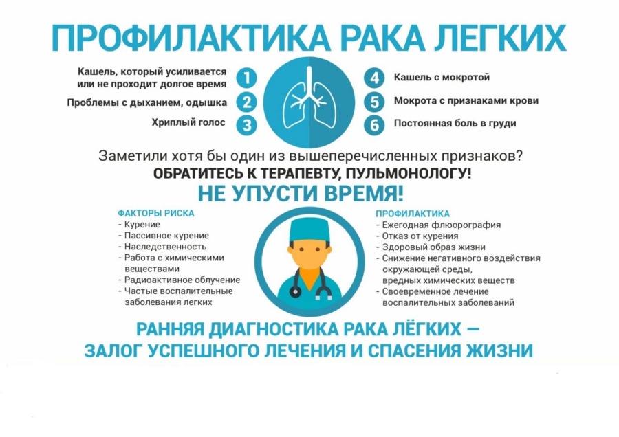 Основой профилактики рака легких является отказ от курения. Полный отказ от табака снижает риск заболевания на 90%, что делает его наиболее эффективным профилактическим мероприятием. Однако даже те, кто курил в течение многих лет, могут значительно снизить свои шансы на развитие рака, бросив курить.
