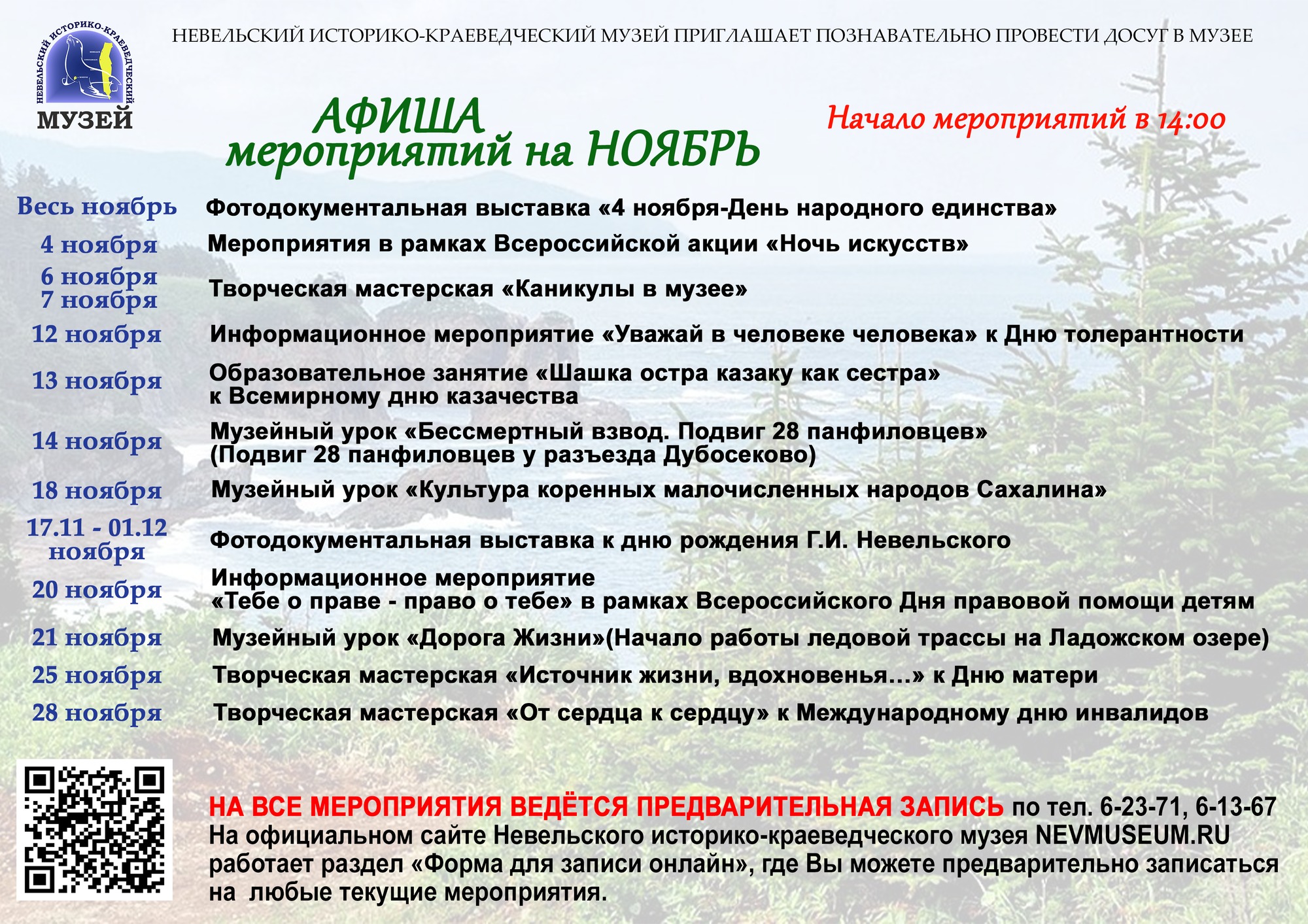 На мероприятия ведется ПРЕДВАРИТЕЛЬНАЯ ЗАПИСЬ по тел. 6-23-71, 6-13-69. Также на официальном сайте Невельского историко-краеведческого музея NEVMUSEUM.RU работает раздел "ФОРМА ДЛЯ ЗАПИСИ ОНЛАЙН", где Вы можете предварительно записаться на любые текущие мероприятия