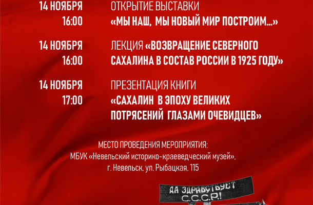 Выставка посвящена 100-летию знакового события в истории региона – восстановлению советской власти на Северном Сахалине в 1925 году. Она рассказывает о сложном и переломном периоде 1917–1925 годов: падении монархии, революциях, Гражданской войне и японской интервенции. Центральное место в экспозиции занимает история долгой дипломатической борьбы, завершившейся подписанием советско-японской Конвенции и выводом японских войск с северной части острова. В фокусе выставки — момент торжественного восстановления суверенитета СССР 15 мая 1925 года, когда вся полнота власти перешла к Сахалинскому революционному комитету, начавшему строительство новой жизни.