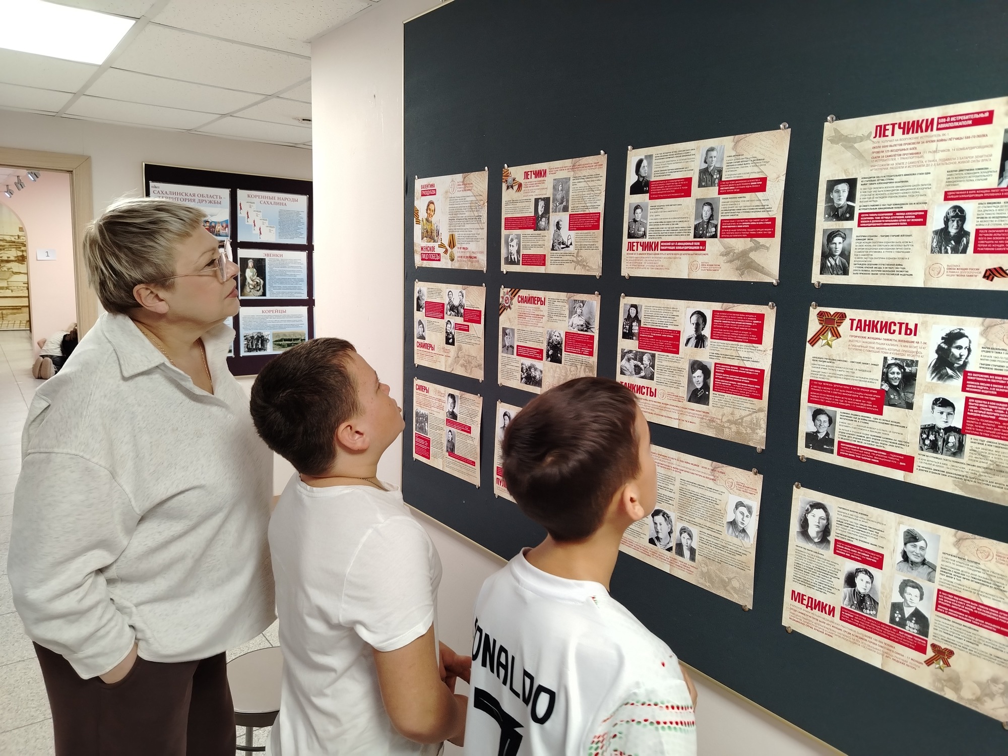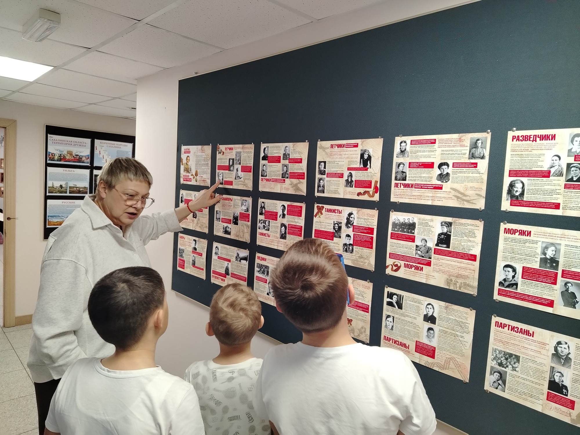При подготовке заданий маршрутного листа был использован информационный материал фотодокументальной выставки «У войны не женское лицо», которая в настоящее время экспонируется в музее. Вниманию посетителей представлены судьбы героинь, которые отважно воевали за мирное небо над головой, будучи труженицами тыла, снайперами, танкистами войск воздушной обороны, бойцами невидимого фронта, летчицами, педагогами, партизанами и подпольщиками. Каждая из историй передает многогранность темы и показывает, как женщины в годы войны стали символом стойкости и мужества, обладая невероятной силой характера, беспредельной стойкостью и любовью к Родине.