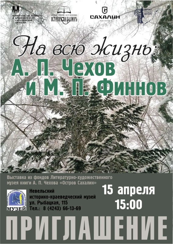 15 апреля 2026 года в 15.00 в Невельском историко-краеведческом музее состоится открытие выставки "На всю жизнь: А. П. Чехов и М. П. Финнов".